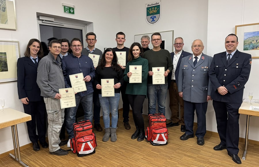 „Für einen kleinen Ort wie Hockweiler ist die hohe Anzahl von acht neuen First Respondern außergewöhnlich“, betonten Bürgermeister Holstein und Hermann Hurth einhellig. Sie lobten nicht nur die beeindruckende Zahl, sondern auch die außergewöhnliche Qualifikation der Helfer: Mit vier Ärzten und Ärztinnen, zwei Rettungsassistenten, einem Rettungssanitäter und einem Anästhesie-Krankenpfleger verfügt Hockweiler über eine beeindruckend kompetente First-Responder-Gruppe, die weit über die geforderten Standards hinausgeht.